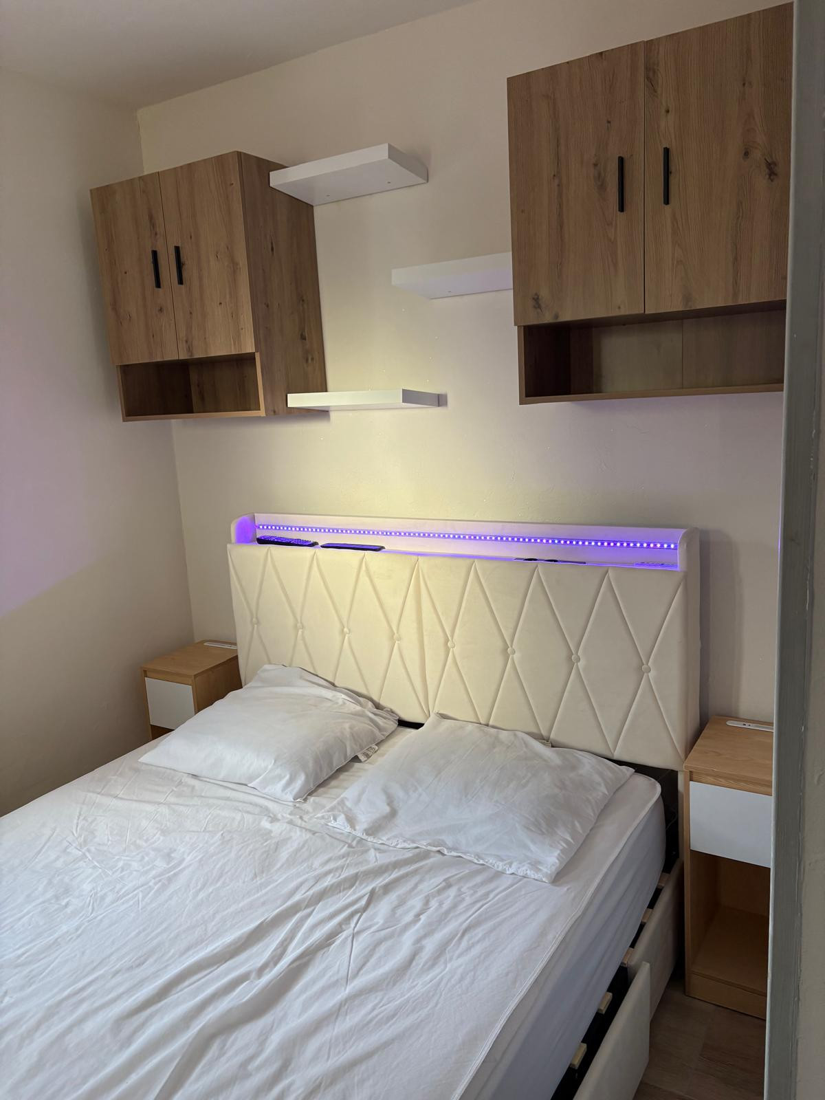 Cet appart dispose d'une chambre avec lit-double, et de deux lits superposés à l'entrée du séjour, pour une capacité de 4 personnes (max 2 adultes), idéal pour une famille avec 2 enfants !