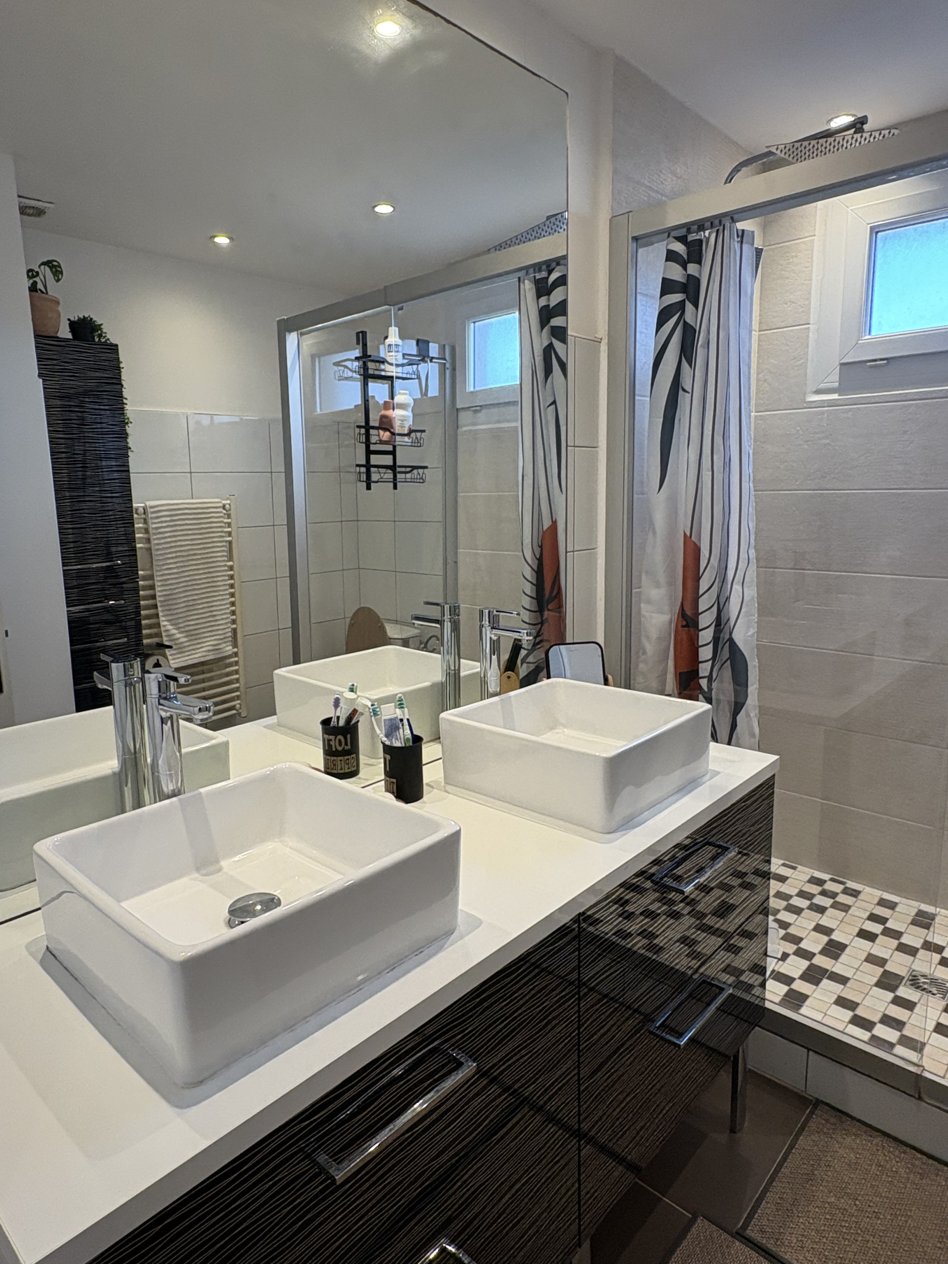 Le logement possède 2 belles chambres avec lit-double, une au RDC qui possède sa propre salle d'eau, et une à l'étage, ainsi que 2 lits simples dans une mezzanine, un séjour lumineux avec espace repas et une cuisine équipée !
