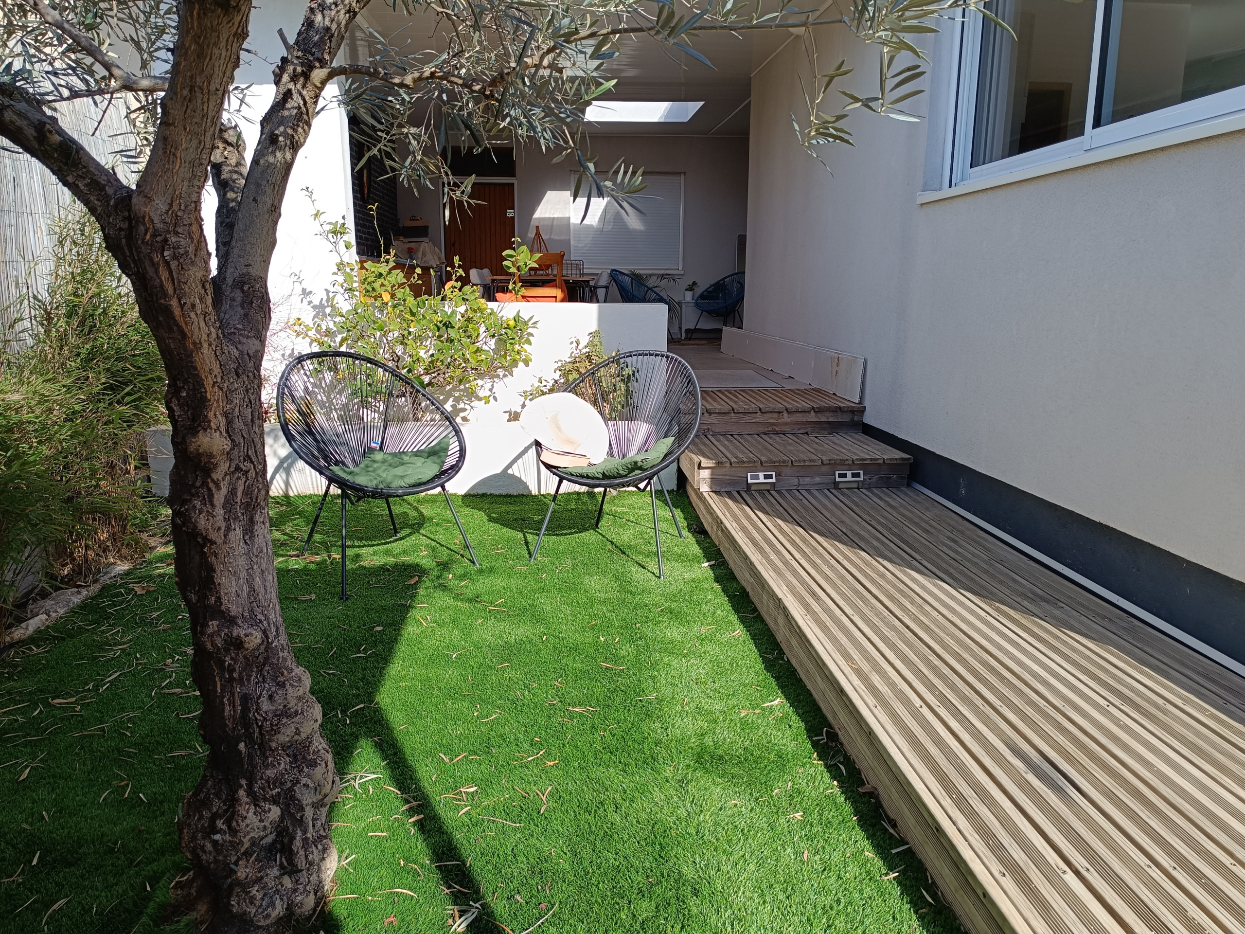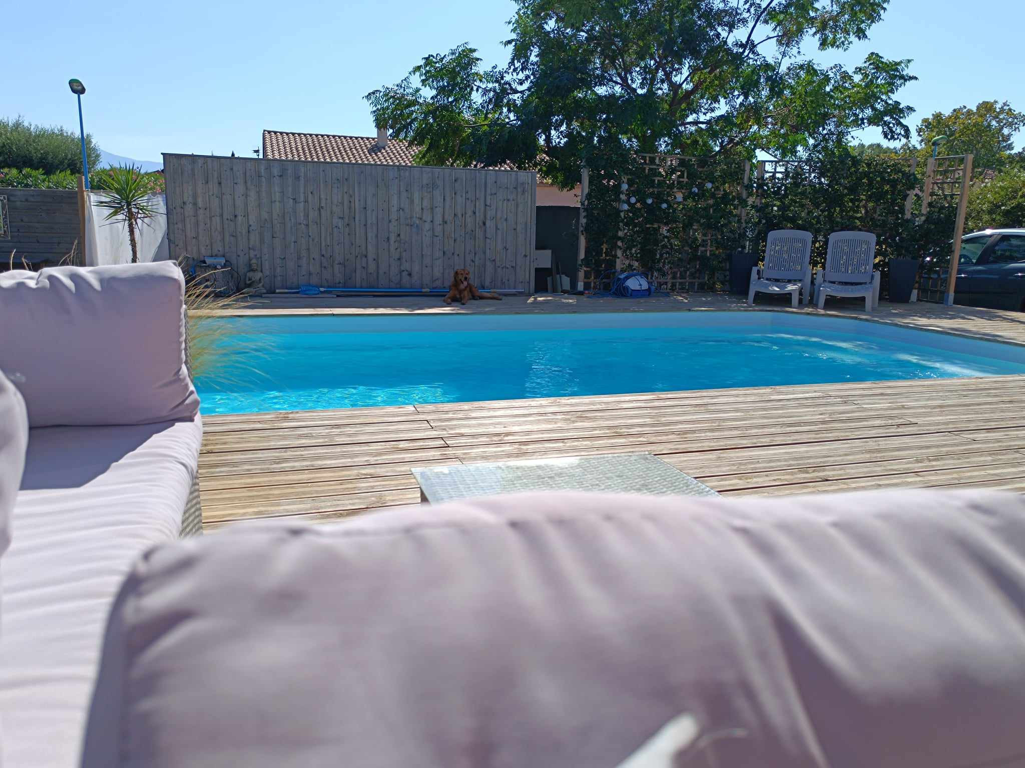 Evidemment ,vous pourrez vous prélasser sur les chaises longues qui entourent la piscine mais aussi prendre l'apéro dans son grand coin cocooning au bord de celle-çi et face au jardin arboré!